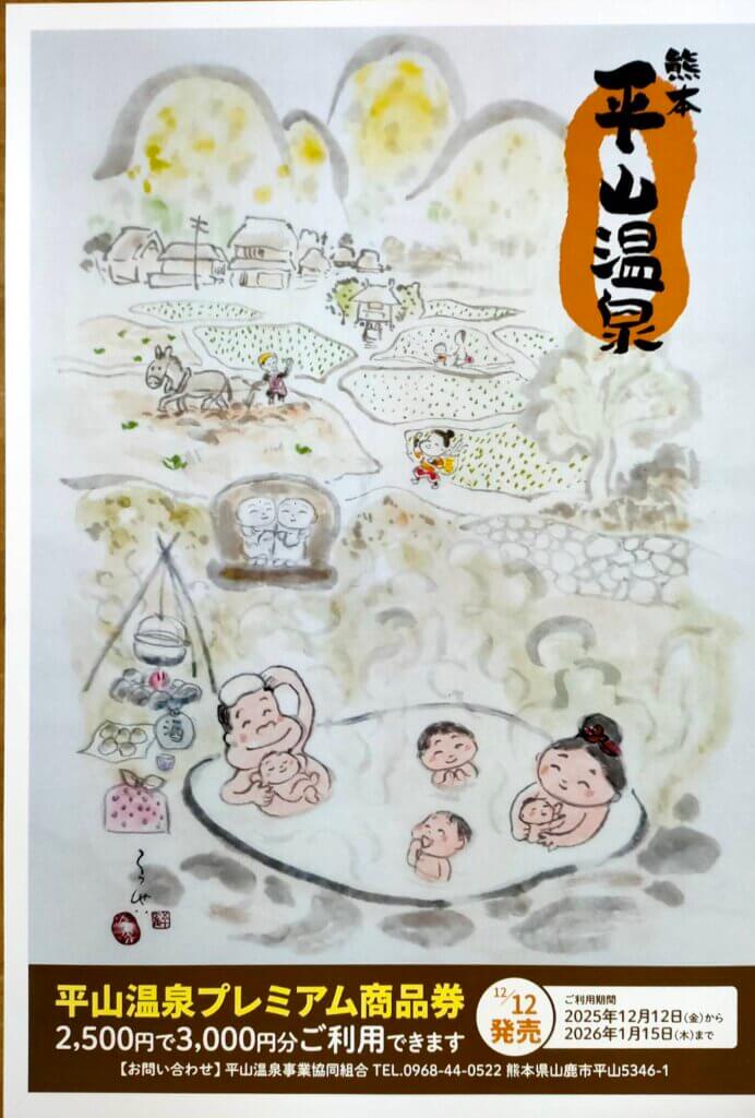 平山温泉プレミアム商品券 2025年12月12日より発売!! 《 2,500円で、3,000円分ご利用できます。 》 ご利用期間・・・2025年12月12日(金)から、2026年1月15日(木)まで。 直接、チラシに掲…