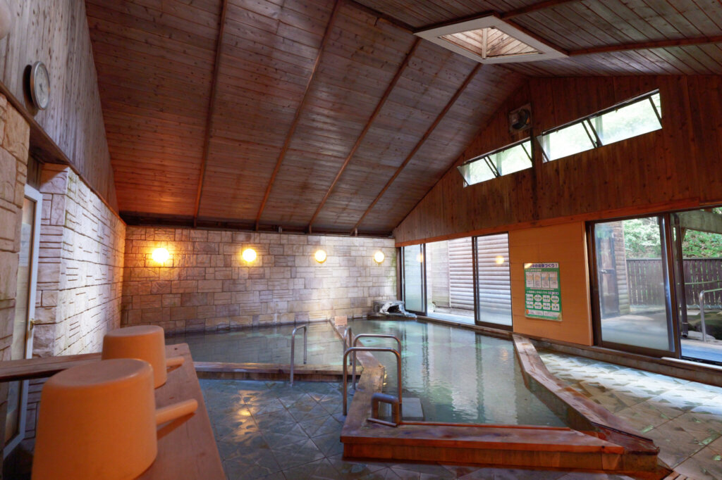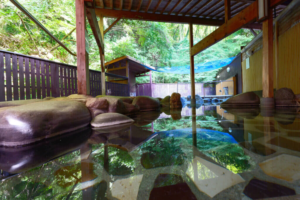 広い大浴場では、森に囲まれた開放感のある露天風呂を楽しめます。